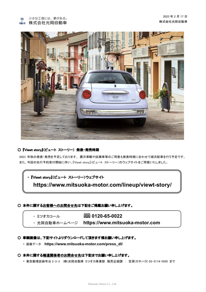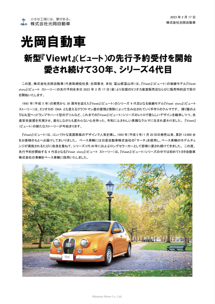 スタッフブログ新型『Viewt』(ビュート)の先行予約受付開始光岡自動車情報 2023.02.17 Viewtの後継モデル「Viewt story」(ビュートストーリー)の先行予約受付を本日より開始致しました! カタログ等のご用意もございますのでご来店お待ちしております。